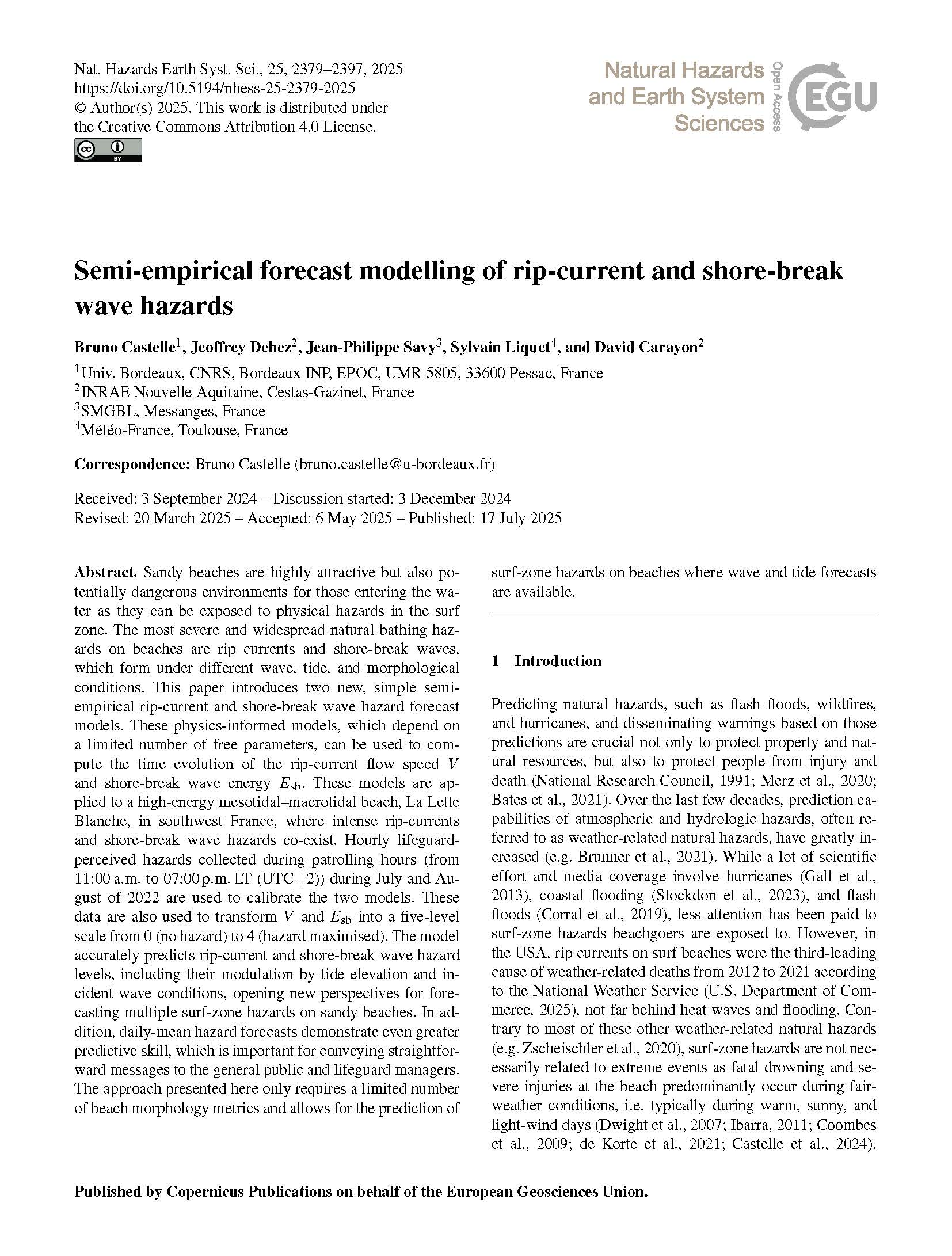 Les plages sableuses sont des environnements très attractifs mais potentiellement dangereux pour les baigneurs, car ils sont exposés à des risques physiques dans la zone de déferlement. Les dangers naturels les plus sévères et les plus répandus sur les plages sont les courants d’arrachement et les vagues déferlantes, qui se forment sous diverses conditions de houle, de marée et de morphologie. Cet article introduit deux nouveaux modèles de prévision semi-empiriques des dangers liés aux courants d’arrachement et aux vagues déferlantes. Ces modèles, informés par la physique et comportant un nombre limité de paramètres libres, permettent de calculer l’évolution temporelle de la vitesse du courant d’arrachement (V) et de l’énergie des vagues déferlantes (E_sb). Les modèles sont appliqués à une plage méso- à macrotidale à haute énergie, La Lette Blanche, dans le sud-ouest de la France, où coexistent de forts courants d’arrachement et vagues déferlantes. Les dangers perçus par les sauveteurs, collectés toutes les heures durant la surveillance (de 11h à 19h, UTC+2) en juillet et août 2022, sont utilisés pour calibrer les modèles. Les résultats montrent que les prédictions sont précises, y compris dans leur modulation par les marées et les conditions de houle. Ces modèles ouvrent de nouvelles perspectives pour la prévision de risques multiples dans la zone de déferlement.