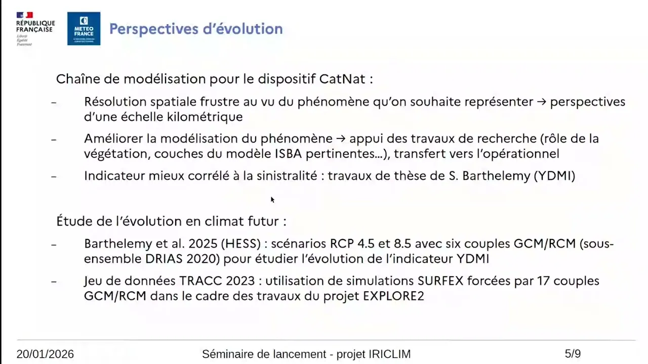 Fil d'Ariane Accueil Vidéothèque Vidéothèque Retrouvez les vidéos présentant le projet et ses thématiques de recherche. Présentation générale du projet Présentation générale du projet IRICLIM lors de sa réunion de lancement, le 20 janvier 2026. © PEPR Risques Projet IRICLIM Présentations thématiques Présentation de Pierre-André Garambois (INRAE). PEPR Risques (IRiMa) Inondations et ruissellements La météo des forêts PEPR TRACCS, de la modélisation au services climatiques L’observation du retrait gonflement des argiles Les données pour la CATNAT sécheresses Etude de la vulnérabilité dans IRICLIM